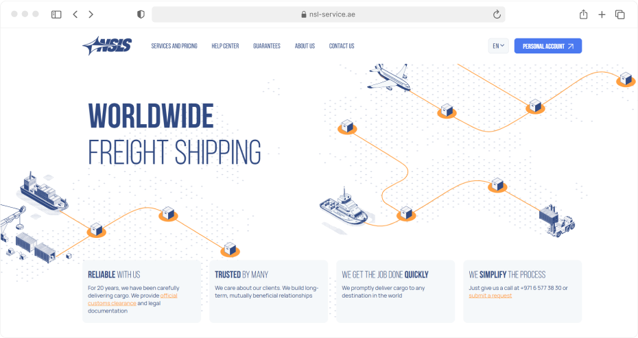 North South Logistics Services — логистическая компания с 20-летним опытом. Они работают с клиентами по всему миру и хотят сделать цифровой сервис удобным для англоязычной аудитории: обновить сайт и запустить личный кабинет. NSLS при обновлении внешнего вида площадки было важно: Дизайн сайта лаконичный и простой. Иллюстрации схематично отражают специализацию NSLS. Мы использовали современную и сдержанную цветовую гамму: Сайт стал витриной услуг: без лишних блоков, только нужная информация. На главной странице — преимущества и ценности в работе, услуги, новости и расписание. Расписание отправок из ОАЭ помогает основным клиентам NSLS, физическим лицам, планировать перевозки с учетом будущих рейсов. Администраторы вносят новый рейс, указывая даты отправления и получения, а система самостоятельно по формулам рассчитывается определенный статус. Смена статусов и скрытие рейса с сайта также происходит автоматически. Сайт информационный, поэтому мы структурировали тексты: Сайт реализован на пл