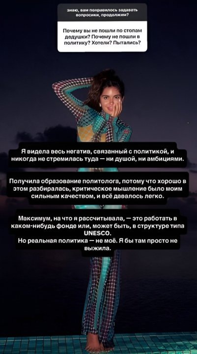 Марям Тилляева, медийная личность и внучка бывшего президента Узбекистана Ислама Каримова, сделала публичное заявление относительно своего карьерного пути. В рамках сессии вопросов и ответов со своей аудиторией в социальной сети Instagram она разъяснила, почему не стала продолжать семейную традицию и входить в политические круги страны.