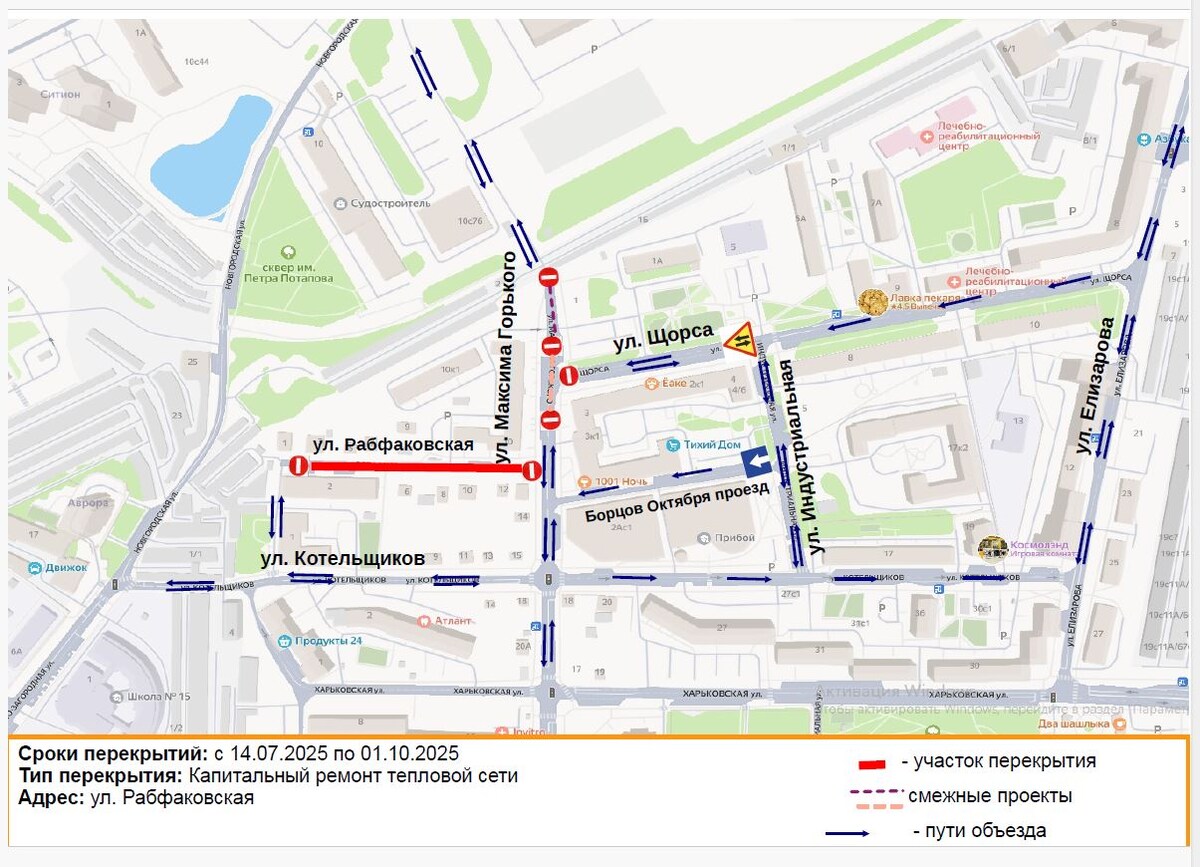 Возможные маршруты объезда: ул. Котельщиков, ул. Максима Горького,