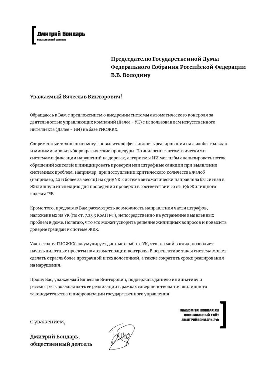 🤖 Предложил внедрить ИИ для контроля за управляющими компаниями — это сделает ЖКХ удобнее для всех! Сегодня направил обращение Председателю Госдумы В.В. Володину с инициативой: использовать искусственный интеллект на базе ГИС ЖКХ для автоматического анализа жалоб жителей. Это поможет быстрее реагировать на проблемы и улучшить работу управляющих компаний. Как это будет работать? ✅ ИИ будет анализировать жалобы жителей — например, если на одну УК поступит 20+ обращений за месяц, система автоматически инициирует проверку. ✅ Штрафы за нарушения можно направляться на устранение проблем в домах, чтобы ремонты выполнялись быстрее. ✅ ГИС ЖКХ уже собирает данные — осталось задействовать современные технологии для их эффективного использования. Это не просто цифровизация на бумаге, а конкретный инструмент, который может помочь: 🔹 Ускорить реакцию на проблемы 🔹 Повысить качество услуг 🔹 Укрепить доверие людей к системе ЖКХ Считаю это отличной возможностью для развития ЖКХ с помощью совр