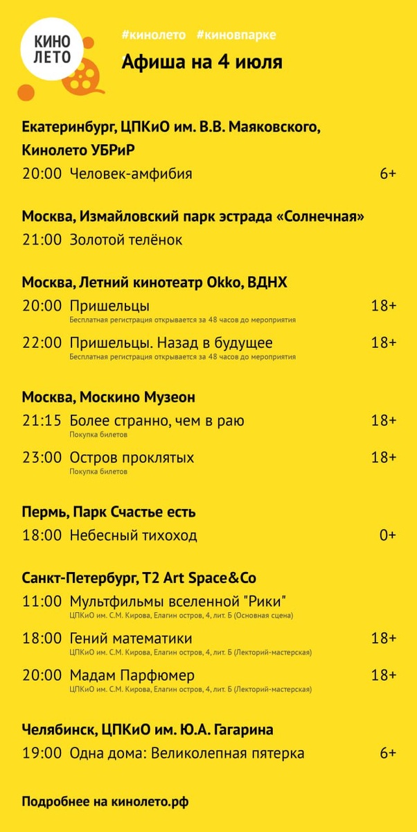 Афиша на 4 июля Возможны изменения, актуальная информация на сайте кинолето.рф Присоединяйтесь к нам https://t.me/cinegramru Обсуждаем кино https://t.me/cinegramru/8 Делимся впечатлениями https://t.me/cinegramru/7 Общаемся https://t.me/cinegramru/27 Наши стикерпаки для вас https://t.me/addstickers/DuhKinoleto https://t.me/addstickers/GhibliMovieHeroes