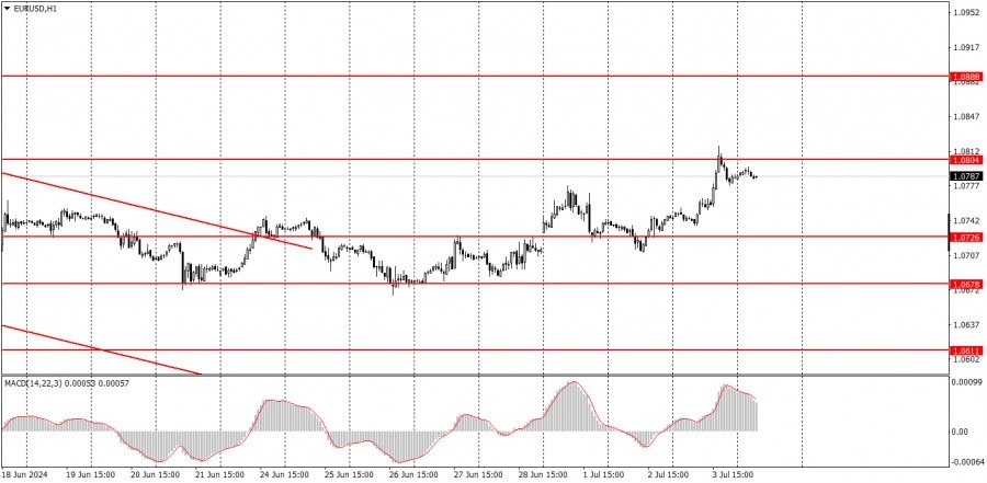 Валютная пара EUR/USD в четверг торговалась до и после публикации Нонфармов и безработицы в США. И до, и после публикации макроэкономической статистики в США наблюдался тотальный флэт. Как только отчеты были опубликованы, цена тут же обвалилась вниз, а в течение следующего часа практически полностью восстановилась. Уровень безработицы в США, вопреки прогнозам, снизился до 4,1%, а количество Нонфармов – выросло на 147 тысяч при прогнозе +110 тысяч. Третий отчет – по деловой активности в секторе услуг ISM – также оказался в пользу американской валюты – индекс вырос с 49,9 пунктов до 50,8 пунктов при гораздо более слабых прогнозах. Таким образом, сама судьба благоволила доллару в четверг, но по итогам дня он сумел вырасти на «нереальные» 30 пунктов, что лишний раз доказывает полное отсутствие желания у трейдеров покупать американскую валюту. На часовом ТФ отлично видно, что цена даже в краткосрочной…