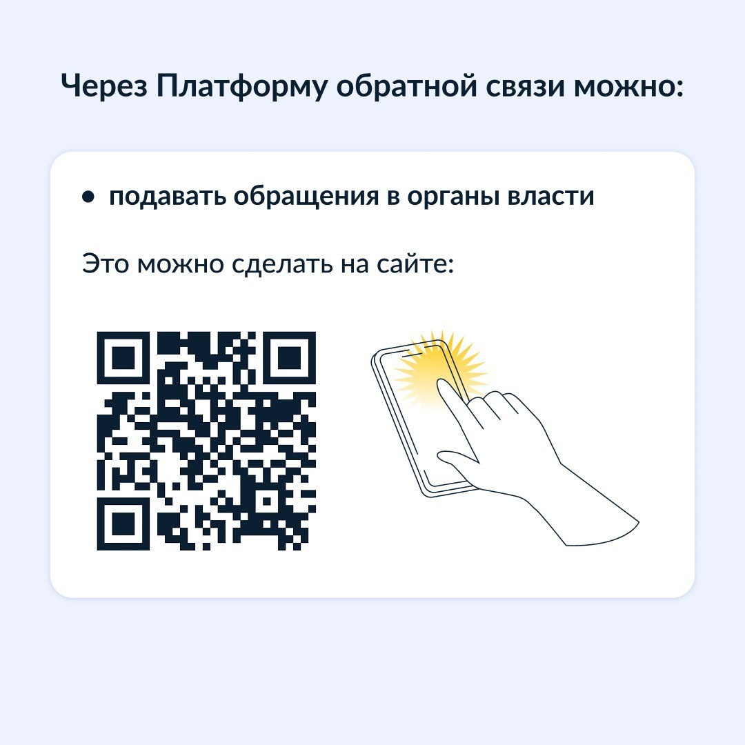 Через Платформу обратной связи https://vk.cc/cNbeHE можно подавать обращения в органы власти и участвовать в опросах. Подробнее о возможностях платформы – в карточках.
