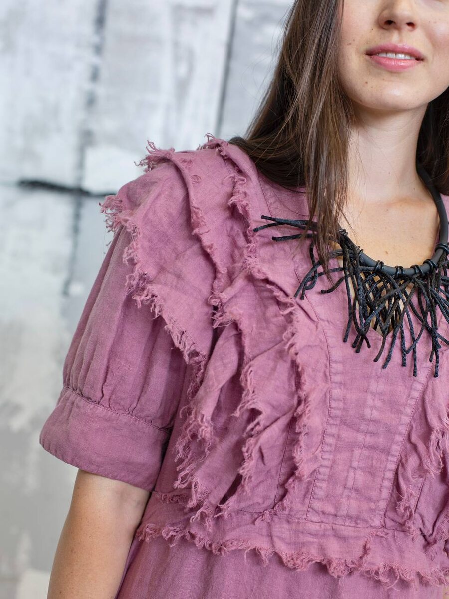 Отрезная талия мягко формирует силуэт, а оборки на груди с необработанными краями придают платью бохо-эстетику и живую фактуру. Натуральный лен обеспечивает комфорт, дышащие свойства и приятную тактильность.