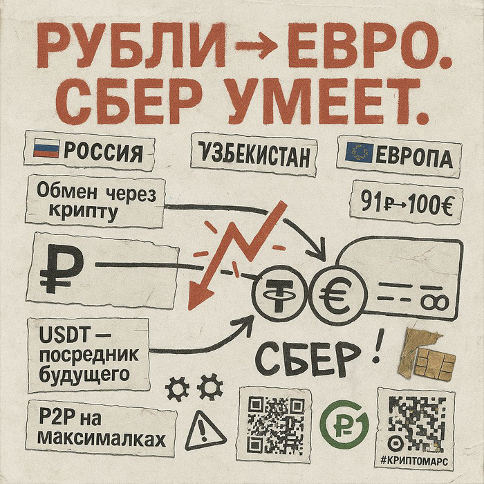 Сбер перехитрил SWIFT. Наши слоны! ⚡️ Переводы проходят не мгновенно, но с конвертацией рубля по курсу около 100 за евро (официальный курс около 92 ₽) 🔥 Это буквально получается какой-то транснациональный теневой P2P арбитраж. Хотя схема легальна - Сбер крипту напрямую не продаёт и якобы у них всё не так, как в P2P. 👀 Нужно посмотреть, можно ли это будет использовать для заработка на международном арбитраже. Как я всегда и говорю - рынок развивается и подстраивается под любые реалии. Пройдите небольшой тест — укажите ваш капитал и свободное время, чтобы получить индивидуальный расчёт: сколько реально можно зарабатывать по проверенной стратегии. 🔍 Пройти тест Только цифры и чёткое понимание без воды.