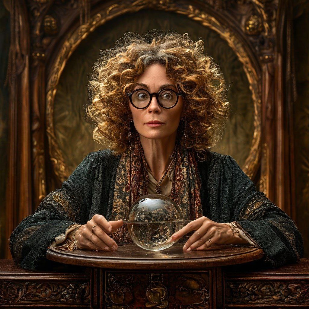 (Душный кабинет в Северной башне Хогвартса. Густой аромат ладана смешивается с запахом старого пергамента. Профессор Трелони, укутанная в десяток прозрачных шалей, жестом приглашает меня сесть за круглый столик, где хрустальный шар тускло мерцает в слабых лучах заходящего солнца.)