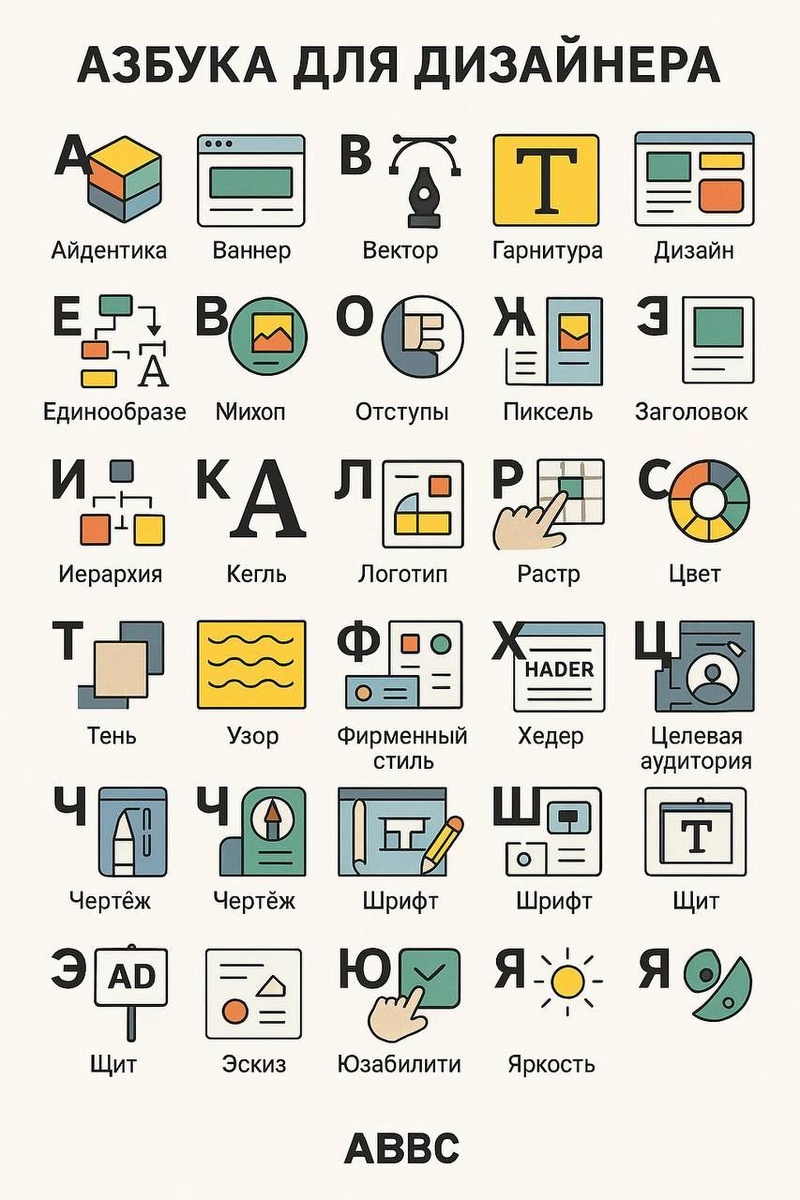 ИИ прочно вошёл в нашу жизнь и генерит всякие азбуки разной степени истерии. Мы решили сделать такую же азбуку для дизайнера.