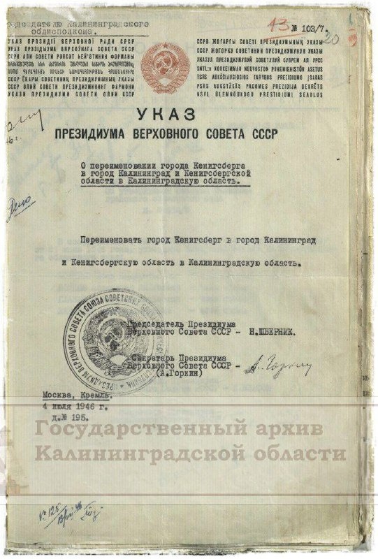 Указом Президиума Верховного Совета СССР от 4 июля 1946 года Кёнигсбергская область была переименована в Калининградскую.