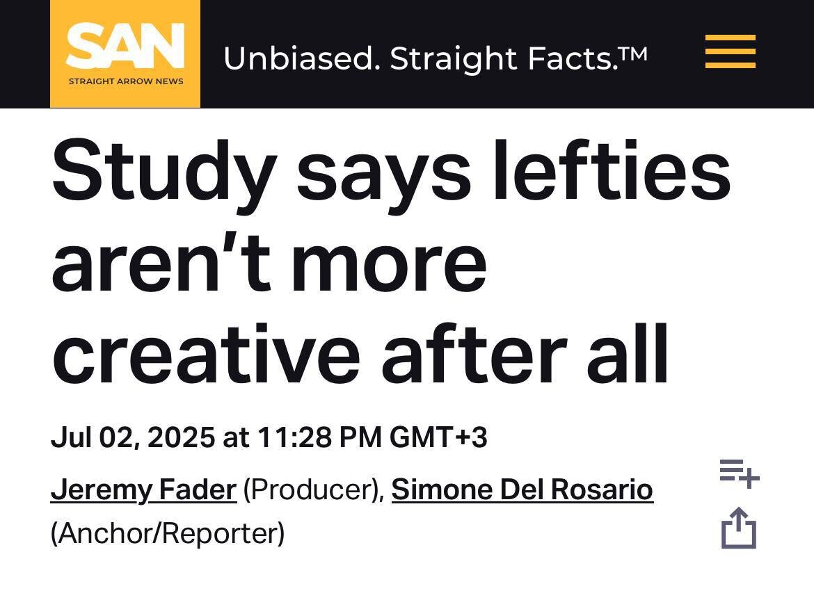 Леворукость ≠ креатив. Учёные проанализировали 17 исследований и снесли в пыль миф о том, что левши якобы гении креатива. Связи между ведущей рукой и творческим мышлением нет. Более того, правши в некоторых случаях даже впереди. Так что если ты левша и ничего не придумал — ты не оригинальный, ты просто обычный. Зато в теннисе и мордобое шансы у тебя получше.