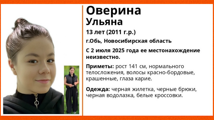 В городе Обь под Новосибирском без вести пропала 13-летняя Ульяна Оверина. Как сообщили в поисково-спасательном отряде (ПСО) «ЛизаАлерт», со 2 июля 2025 года ее местонахождение неизвестно, поэтому к поискам подключились волонтеры. Приметы пропавшей: рост 141 сантиметр, нормального телосложения, волосы красно-бордовые крашенные, глаза карие. В день исчезновения подросток была одета в черную жилетку, черные брюки, черную водолазку и белые кроссовки. Если у вас есть информация о местонахождении Ульяны Овериной, сообщите об этом по телефону ПСО 8-800-700-54-52 или наберите 112. Ранее «Вести Новосибирск» писали, что Новосибирске нашли живой 14-летнюю школьницу с пирсингом в носу.