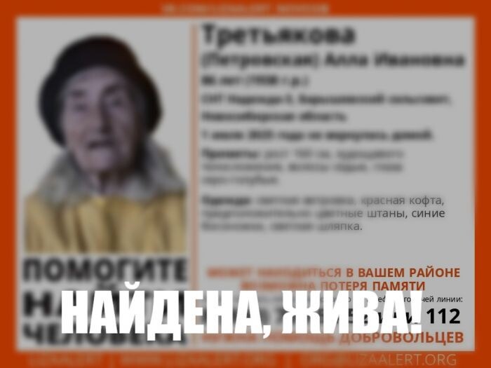 Пропавшая в СНТ недалеко от новосибирского Академгородка пожилая женщина нашлась живой, сообщили в соцсетях волонтеры поисково-спасательного отряда «ЛизаАлерт».