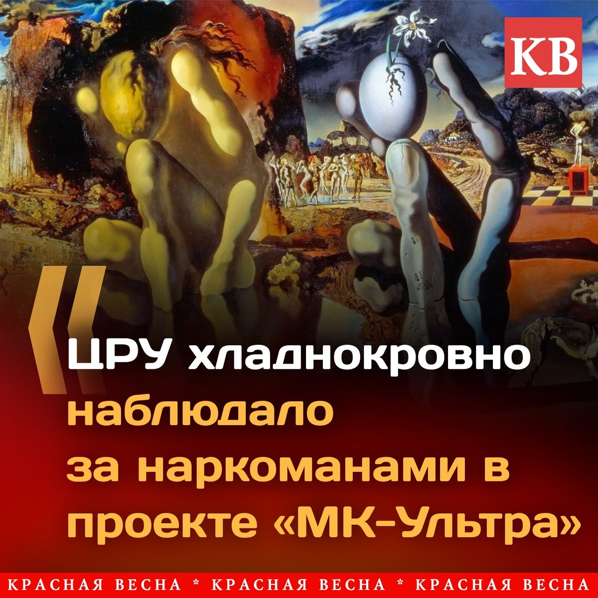 Исследования в области манипуляции сознанием ЦРУ проводило, финансируя программу «МК-Ультра», в рамках которой уже зависимым «наблюдаемым» предлагался свободный доступ к психоактивным веществам. Такие вещества применялись также в случаях, когда необходимо было воздействие на неудобных свидетелей с трагичным исходом... Профессор Гарвардского университета Ребекка Лемов рассказала 15 мая в интервью журналисту Джо Рогану о своих исследованиях в области технологий манипуляции сознанием. ЦРУ США было заинтересовано в проведении исследований в этой сфере и разработало для этого программу «МК-Ультра». ИА Красная Весна предлагает перевод фрагмента интервью, затрагивающего эту тему. 📖 Читать далее: ЦРУ хладнокровно наблюдало за наркоманами как подопытными в проекте «МК-Ультра» @ia_rossa ✍️ #ИАКВ #ИАКВ_аналитика