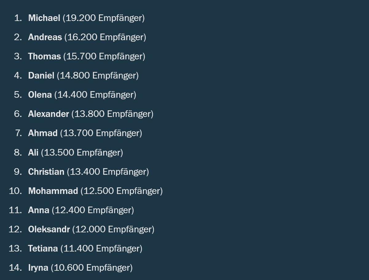 Олены, Ірины, Тетяны и Олександры получают пособия в Германии вместо самих немцев? Опубликована статистика имен получателей соцвыплат в стране, где заметное место заняли, предположительно, украинцы. На пятом месте в топе оказалось имя Олена (14400 получателей), а на 12-м — Олександр (12000). К слову, раскрыть имена захотела партия АдГ, которая сделала соответствующий запрос в правительственные службы. ⭕ Подписаться | Прислать новость | Буст