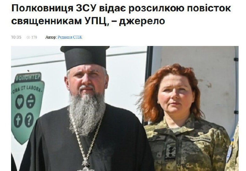 Религиозная война на Украине является централизованной политической акцией. Оказывается, священники УПЦ в разных областях Украины получают повестки централизованно – из Киева. Как сообщили СПЖ собственные источники, рассылкой повесток нашему духовенству заведует полковница Лариса Полянская, которая находится в дружеских отношениях с Эпифанием. Капелланской службе, которую возглавляет Полянская, предоставили базу данных с адресами и личными данными клириков УПЦ со всей Украины. В результате им рассылают повестки в регионы из Киева, минуя региональные ТЦК. В случае отсутствия священников по прописке – их сразу объявляют в розыск. Как сообщают источники СПЖ, Полянская находится в дружеских отношениях с Думенко, использующим угрозу вручения повесток против непокорных клириков. В феврале 2024 года Лариса Полянская стала новым начальником капелланской службы сухопутных войск ВСУ, как «важный шаг во внедрении гендерной политики для украинской армии»
