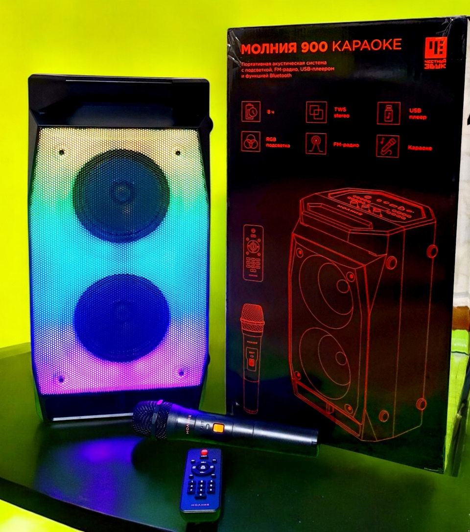 Компания «Урал» имеет большой список оборудования для автомобиля это, акустика, усилители, сабвуферы, различные аксессуары и вот линейка портативной акустики для домашнего использования.Можно глянуть на сайте Модель имеет индекс 900 и является старшей в линейке. Её мощность составляет 90 ватт. Но самое главное — это цена. Она составляет примерно от 7000 рублей, но не превышает 9000 рублей на различных маркетплейсах стоит поискать. И это при всех заявленных характеристиках, функциях и возможностях. На мой взгляд, предложение очень привлекательное. Колонка поставляется в красивой картонной упаковке с удобными переносными ручками в глянцевом исполнении. В комплект входят пульт дистанционного управления и два кабеля: один для зарядки через USB, другой для подключения по проводу через AUX, + микрофон для караоке работающий на 2х элементах питания типа АА. Колонка имеет довольно не большие размеры и весит около 4,5 кг, но благодаря удобной ручке сверху спереди она легко переносится. Также ко