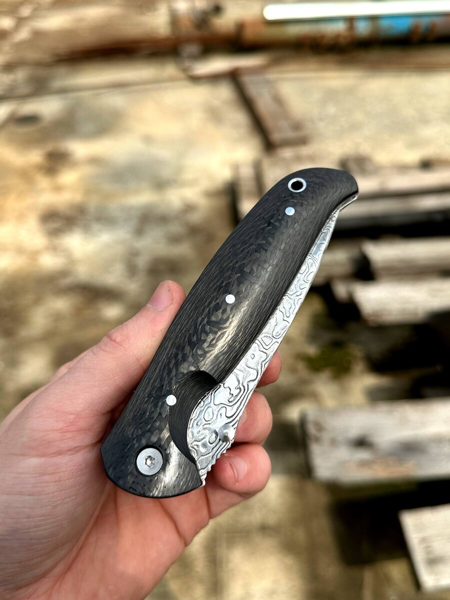 Ещё не так давно, нержавеющий дамаск был чем то из области фантастики. А сейчас это реальность ! Не дешевая конечно, но разве красота не требует жертв ?! Складной нож Корвет с клинком из нержавеющего дамаска c накладками рукояти из карбона. Характеристики изделия: Твердость клинка 62 HRC Тип замка Liner lock Цена по акции: 41335 руб. Обычная цена 45929 руб. Можем изготовить формованные ножны из кожи растительного дубления (+ 8000 руб.) Для заказа писать на @Nazarklinokbot или по тел +79101343831, WhatsApp