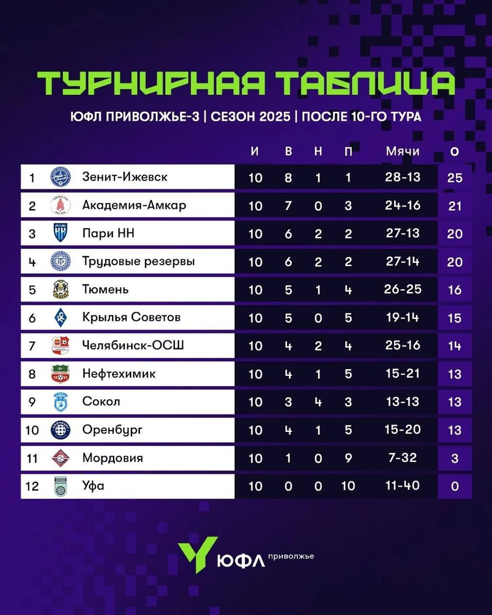 Турнирные таблицы ЮФЛ после завершения очередного тура