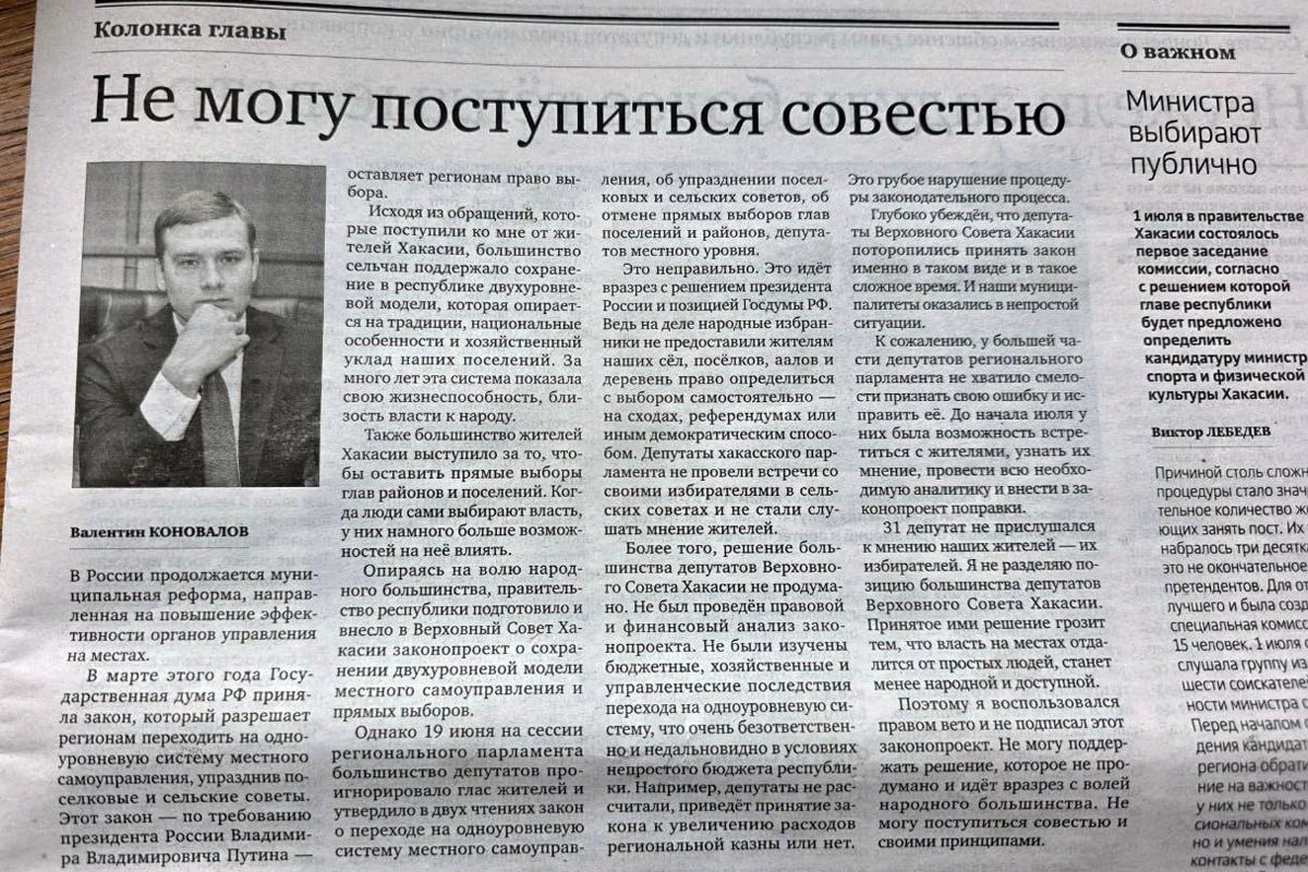 Глава Хакасии: «Власть на местах отдалится от простых людей» Глава Хакасии Валентин Коновалов (КПРФ) опубликовал колонку в республиканской газете «Хакасия». Он объяснил, почему наложил вето на законопроект о ликвидации сельских советов и отмене прямых выборов глав, который принял подконтрольный «Единой России» парламент. «Исходя из обращений, которые поступили ко мне от жителей Хакасии, большинство сельчан поддержало сохранение в республике двухуровневой модели, которая опирается на традиции, национальные особенности и хозяйственный уклад наших поселений. За много лет эта система показала свою жизнеспособность, близость власти к народу, — пишет Коновалов. — Также большинство жителей Хакасии выступило за то, чтобы оставить прямые выборы глав районов и поселений. Когда люди сами выбирают власть, у них намного больше возможностей на неё влиять. Опираясь на волю народного большинства, правительство республики подготовило и внесло в Верховный Совет Хакасии законопроект о сохранении двухур