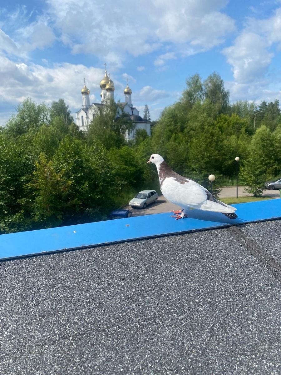 Голубь ручной, делает небольшой облет и возвращается на здание ТЦ. Обитает на лестничной площадке уже 3 сутки, со 2 июля.