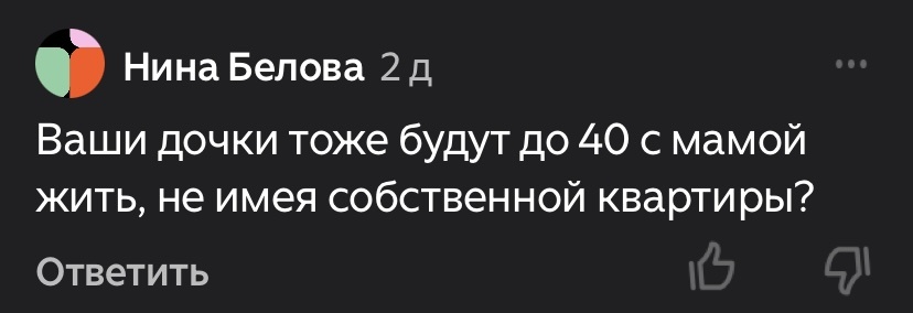 Эта фраза была написана с осуждением и издёвкой. Как будто жить с родителями — это всегда признак несостоятельности. Как будто к 40 годам каждый обязан не только иметь квартиру, но и полностью «отчитаться» перед обществом. А если нет — позор и клеймо «несамостоятельный». Комментарий был оставлен под этой статьёй👇