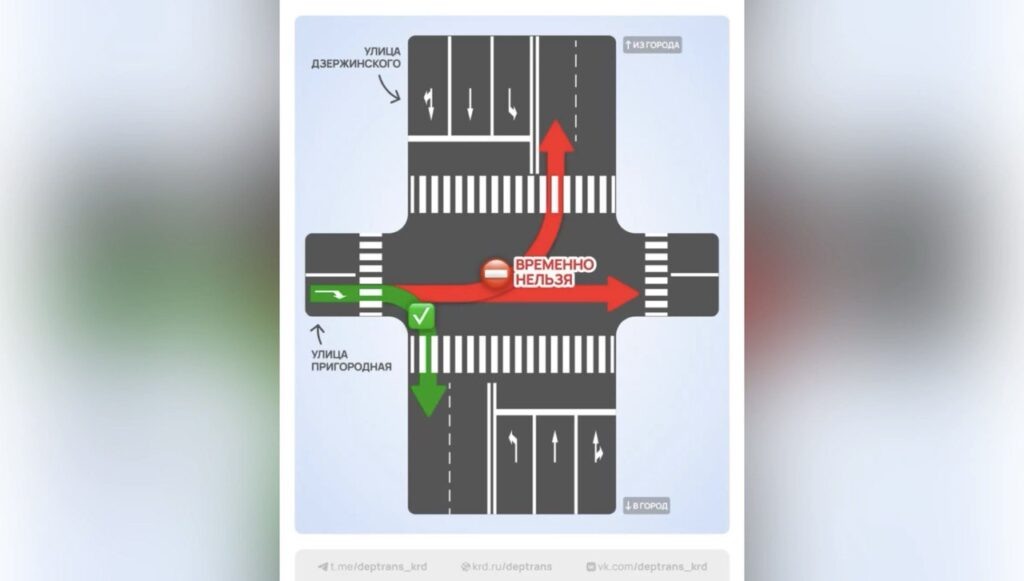 С 4 на 5 июля на перекрёстке ул. Дзержинского и Пригородной в Краснодаре изменят схему движения. Ограничения введут на время дорожных работ на ул. Изосимова. Дептранск Краснодара сообщает, автомобилистам, едущим по Пригородной со стороны кладбища, будет доступен только поворот направо — в сторону центра. Прямо и налево проезд закроют. В качестве объезда рекомендуют ул. Дорожную и 3-ю Трудовую. При движении от железной дороги транспорт будет идти без изменений.