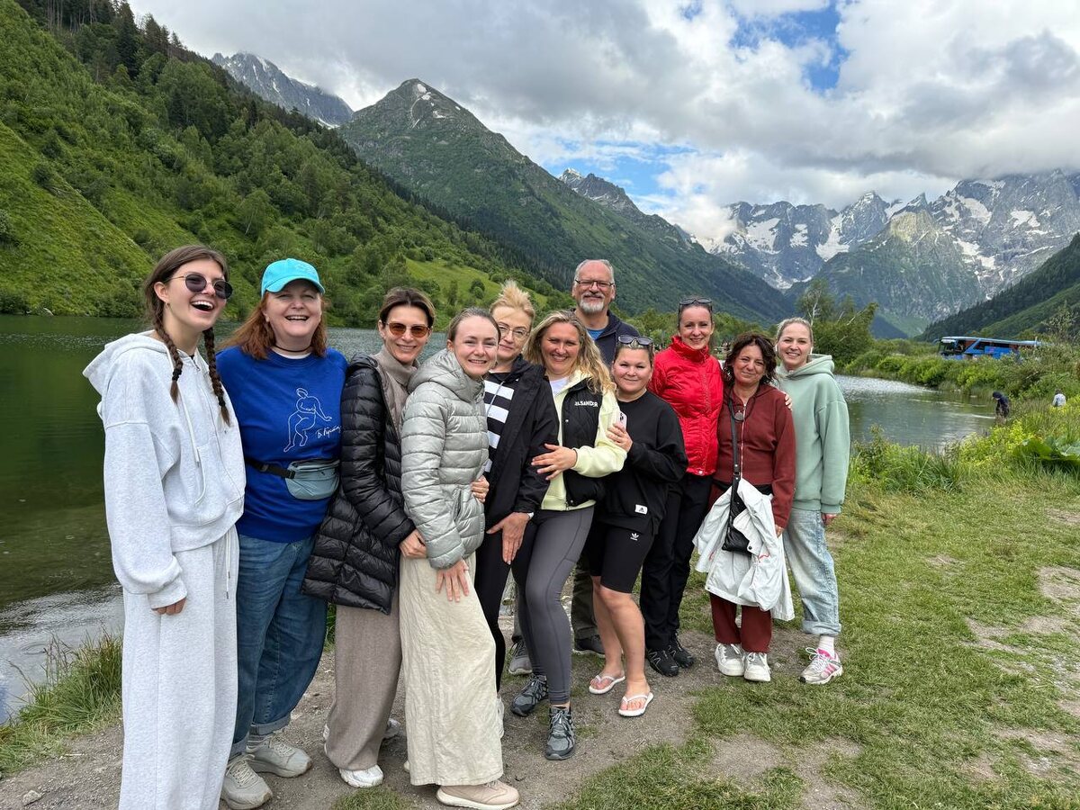 Кинезиотуризм-2025 День 4 В живописных горах Архыза, окружающих отель, наше утро началось на рассвете. Завтракали мы уже в карачаевском подворье в ауле Верхняя Теберда у гостеприимной хозяйки Ларисы. Угощались шакшукой, хычинами, кашей бышлак биширген, кукурузными лепешками и айраном. И с новыми силами отправились на Домбай, который встретил нас солнечной погодой. Мы поднялись на три очереди канатной дороги, особенно запомнилась поездка на кресельной её части. Как же прекрасен Главный кавказский хребет! По дороге Великого шёлкового пути и с рассказами о местной истории и легендах мы приехали к следующей остановке маршрута – Гоначхирскому ущелью и озеру Туманлы-Кёль. На мой взгляд, это место ничуть не уступает по силе самым популярным локациям для посещения. На обратной дороге мы набрали питьевой воды из волшебной реки. И приехали на форелевое хозяйство, где сначала феерично ловили рыбу, а после ужина участвовали в мастер-классе Марко Радо. Он рассказал о волшебном комплексе акупресс