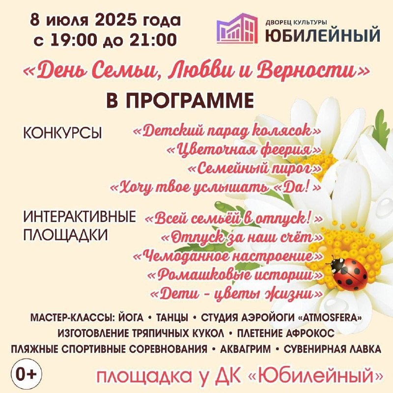 Бузулучан и гостей города приглашают на празднование Дня семьи, любви и верности🫶🏻 В программе увлекательные конкурсы, мастер-классы, интерактивные площадки. Празднование состоится 8 июля на площадке перед ДК «Юбилейный». Начало в 19.00. Приходите, будет весело!