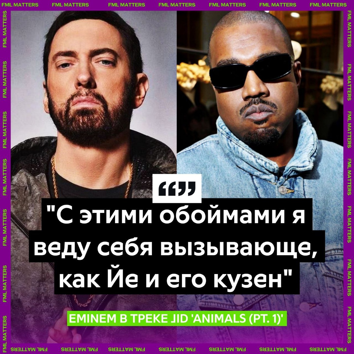 В ответ на пост ‼️ EMINEM СДЕЛАЛ ОТСЫЛКУ НА KANYE WEST И ЕГО КУЗЕНА! Маршалл в новом треке JID «Animals (Pt.1)» из его нового микстейпа упомянул Йе отсылаясь к недавней истории: With these magazines, I act out like Ye and his cousin Это отсылка к треку «COUSINS», где Йе рассказал, что сосал член своего двоюродного брата до 14 лет, а позже его кузен попал в тюрьму за убийство. Послушать трек и другие пятничные новинки можно в FML MUSIC 💀 FML MATTERS