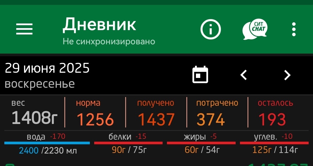 Здравствуйте! 🌻 Продолжаю похудение. Худела с 73,5 кг хочу вес в 50 кг. Рост 151см, возраст 46 лет, вес на данный момент 60,900кг. Сбросила ещё 0.400кг Считать калории начала 04.06.25. Сегодня 04.07.25. Получается, что ровно за месяц у меня ушло веса: 2,000 кг. Неплохо, но вот по внешнему виду почти и не скажешь. Щеки пока на месте) Хотя такой темп похудения самый оптимальный. За полгода можно сбросить более 10 кг. Мне осталось сбросить до моей цели как раз 10-11кг. Но это ещё огромный лишний вес для моего роста... 🙄 Калории за день: 30 июня калории не считала. Ночевала у подруги. Дневные калоражи буду публиковать раз в неделю за неделю. И просто с калориями без меню, которые у меня были. Лень мне делать отдельно скриншоты с меню. Потом редактировать, обрезать. И так статьи забирают много времени. А моё похудение по сути, кроме меня никому и не нужно. Поэтому эти отчёты я буду писать скорее для себя. Что бы они не давали мне всё прекратить. А желание бросить эти подсчёты