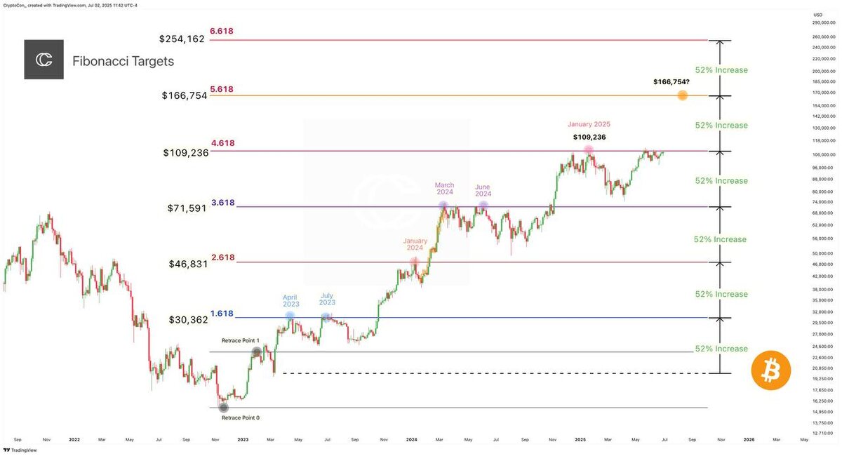 Фибоначчи упрямо указывает на $166,000 Интересно, как некоторые цели кажутся безумными… пока цена не доходит до предыдущих «безумных» уровней. На этом графике — расширения по Фибоначчи от ключевых уровней цикла. И всё, что вы видите, — это последовательность прироста в 52% от уровня к уровню. • 1.618: $30,362 • 2.618: $46,831 • 3.618: $71,591 • 4.618: $109,236 — достигнуто • 5.618: $166,754 — следующая цель? • 6.618: $254,162 — финальный экстремум? И вот что важно: каждый уровень отрабатывал почти идеально. Это не гарантия, но явно не совпадение. Мы словно поднимаемся по ступеням строго вымеренной лестницы. Сейчас до $166k остаётся +52% от текущих. Это кажется много. Но не для BTC, который уже прошёл путь от $15k до $105k — +600%. Скорость достижения может варьироваться. Автор модели ожидает сентябрь, но цикл замедлился по всем фронтам. Это даёт нам время — либо усилить позиции, либо подготовиться к выходу. К чему всё идёт? Фибоначчи показывает, что рынок ещё не завершён. И если