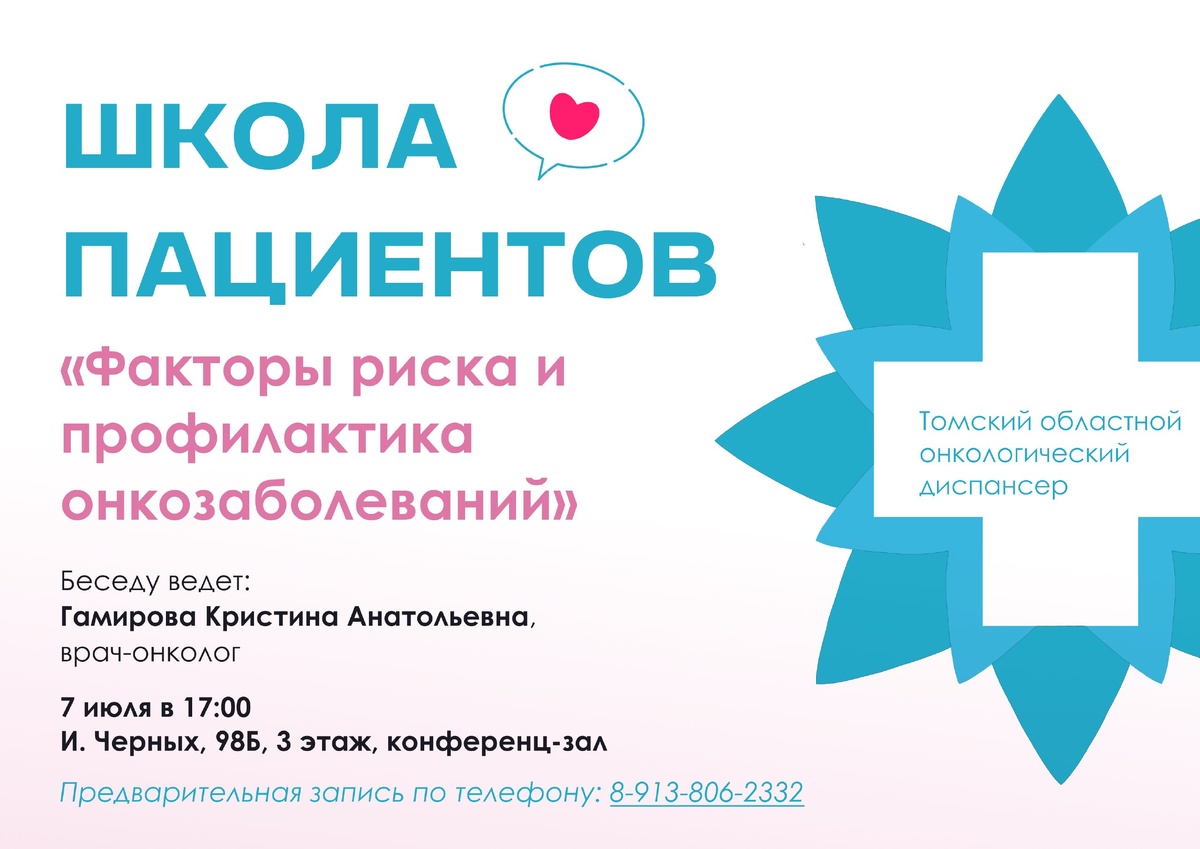 Дорогие друзья! Приглашаем вас присоединиться к новой Школе пациентов, посвящённой фактором риска и профилактике онкозаболеваний.