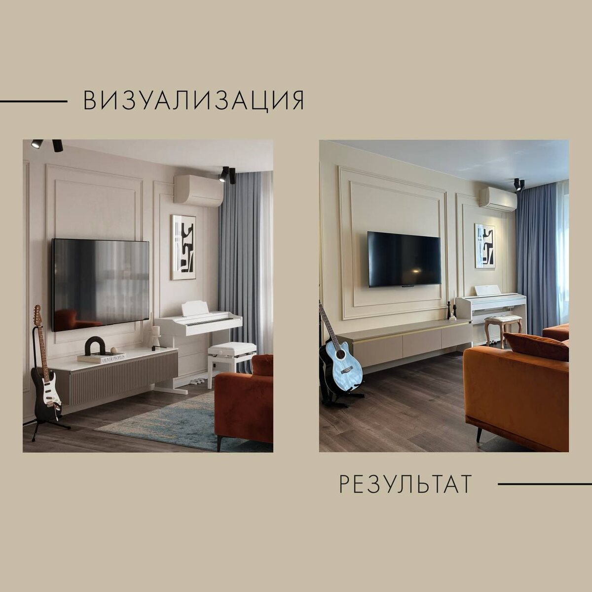 На этом проекте особенно тронуло, что заказчица самостоятельно написала картину, вдохновившись нашей визуализацией. Та самая работа, что висела на рендере, теперь украшает её интерьер — вживую.