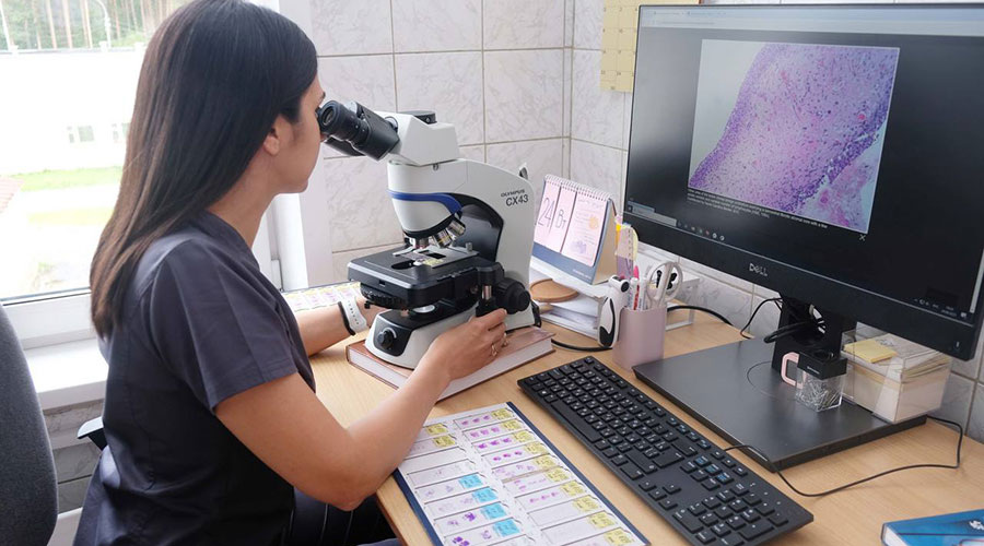 Современное оборудование помогает врачам-патологоанатомам эффективно сопровождать весь процесс противоопухолевого лечения пациентов. Новые микроскопы универсальны и позволяют каждому специалисту настраивать их под свои нужды. Можно регулировать световые и цветные фильтры, яркость, резкость и количество объективов. Встроенные камеры выводят изображение на монитор, что помогает коллегам обсуждать сложные клинические случаи.