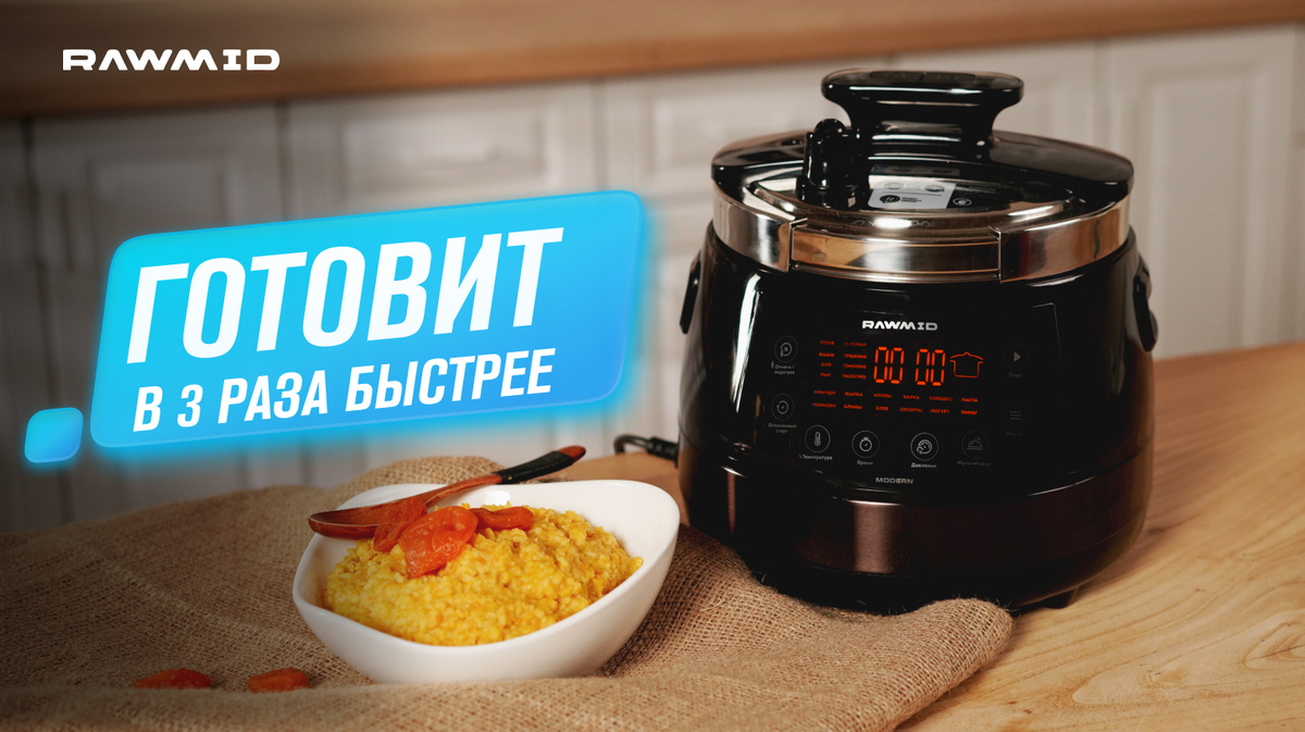 В повседневной суете часто не хватает сил и времени на приготовление домашней еды, а хочется питаться вкусно и полезно. Метод готовки под давлением помогает справиться с этой задачей, сохраняя питательную ценность продуктов. Такая функция есть у мультиварки-скороварки, благодаря которой блюда готовятся в 2-4 раза быстрее, чем в обычной мультиварке или на плите. Мультиварка-скороварка RAWMID имеет 19 автоматических программ, 9 из которых идут без давления в приготовлении: Томление, Разогрев, Фритюр, Жарка, Попкорн, Блины, Хлеб, Десерты, Пирог. Остальные 10 программ готовят под давлением: Плов, Каши, Тушение, Суп, Пар, Крупы, Варка, Холодец, Паста, Йогурт. Принцип работы программ с давлением В режиме готовки под давлением крышка герметично закрывается, и пар, который образуется при нагревании жидкости, не выходит наружу. Он накапливается и за счет этого создается избыточное давление. Температура внутри может достигать 110-120 °C, что и обеспечивает быструю термообработку продуктов. Скоро
