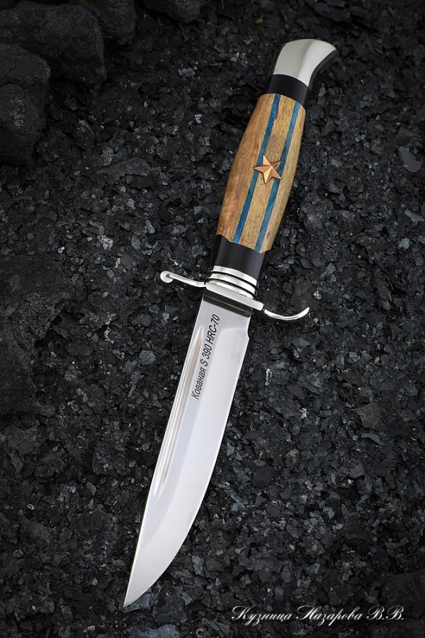 Реплика нескладной Финки НКВД с клинком из стали S390, декорированной рукоятью из черного граба и янтарной карельской берёзы, украшенной мельхиором.