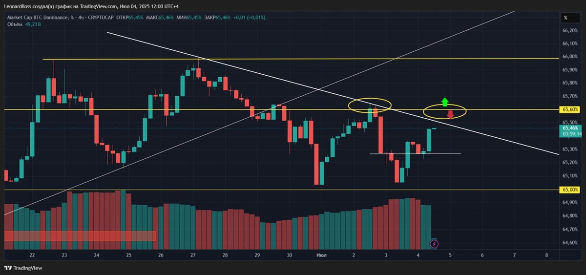 В ответ на пост #мнениепорынку 🕯🕯🕯 Всех приветствую, коллеги! На рынке относительное спокойствие, с короткими прыжками в обе стороны. Давайте посмотрим на альты через график доминации BTC. ⚠️График с 4Н ТФ, рабочий среднесрочный ТФ. Сформировалась не очень приятная картина для альтов, в части ближайших лонгов. При этом, началом ее реализации будет выход значения выше локальной трендовой сопротивления, которая появилась день назад. Там же находится известный вам уровень 65,60%, на котором я заострял внимание 2 дня назад и посмотрите, как он отлично отработал, дав альтам пендаль для прыжка!! ⚠️Второй, график BTC, 4Н ТФ. Цена всё еще находится в зоне трендовой, но, последняя 4Н свеча закрылась на продолжение снижения. Будет ли это очередная манипуляция, увидим прямо сегодня. Нежелательно закрываться ниже уровня 108К, в таком случае есть большая вероятность отработки сценария из прошлого поста, а именно заполнения пустоты внизу треугольника!! P.s. итак, на что смотрим и что делаем с