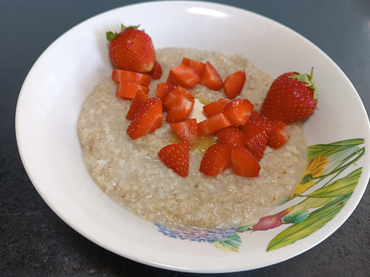 Здравствуйте, дорогие друзья! Наконец-то выросла своя клубника и как тут не вспомнить о "Летней каше с клубникой"! Вот уж точно самый быстрый и недорогой рецепт. Нам понадобятся; Овсяные хлопья, Вода, Соль, Сахар, Сливочное масло, Клубника. В воду добавляем соль и сахар, доводим до кипения. Высыпаем в кипящую воду овсяные хлопья и варим по инструкции на упаковке. В готовую кашу добавляем кусочек сливочного масла и нарезанную клубнику. Попробуйте, вкусно необыкновенно! Я часто варю на завтрак овсяную кашу и добавляю то яблоки, то абрикосы, а то и просто сгущенку. Но каша с клубникой особенно вкусная и ароматная!