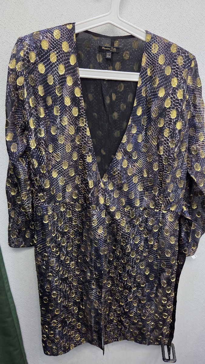 Всем привет! Сегодня будет небольшая подборка платьев, которые повстречались мне в разные походы в комиссионный магазин. Объединяет их одно - наличие шёлка в составе. Что-то будет только из него, а что-то - из смеси с другими материалами. Будут и примерки, и вещи на плечиках. Давайте смотреть! Начнём с вечернего варианта - с платья от Massimo Dutti за 900р. Сочетание чёрного и золота уже отсылает нас к чему-то праздничному, повышая градус торжественности. Я не являюсь поклонником анималистичных принтов, но здесь чешуйки и расположенные поверх них золотые пятнышки смотрятся вполне неплохо.