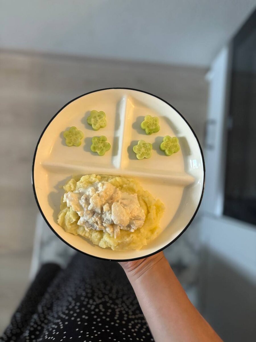 Треска в сливочно-чесносном соусе Девочки, я нашла способ накормить ребёнка рыбой! Нужно просто приготовить ее по этому рецепту) Арина съела все и попросила добавку, рыбка получается очень нежной! 🍴🍴🍴 -500 грамм филе трески (подойдет любая рыба) - Сметана 3 ст. ложки - чеснок, соль Филе режем на небольшие кусочки, я беру спинки и режу кусочки ~3 см. Делаем в миске соус - смешиваем сметану, немного воды, соль и чеснок. Выливаем соус в сковороду, включаем огонь, и когда соус нагреется - выкладываем рыбку. Закрываем крышкой и тушим 10-12 мин на небольшом огне. Я брала охлажденную рыбу, и она во время приготовления разошлась по сегментам, есть такую рыбу очень удобно ребёнку! Подала с картофельным пюре 🩷 #МамНакорми