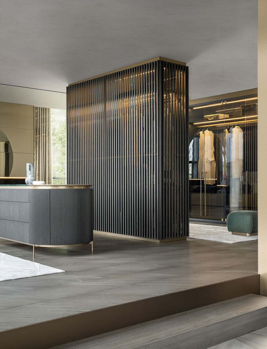 Центральный элемент конструкции — фасады, составленные из реечных вставок из тёмного дуба, стекла с бронзовой тонировкой и тонких латунных деталей. Такое сочетание материалов создаёт выразительную ритмику и подчёркивает графику фасадов. В качестве опоры используется массивный цоколь — он придаёт конструкции монументальность и создаёт выразительный контраст с насыщенными тонами фасада. Встроенная LED-подсветка формирует мягкую, атмосферную картину в интерьере. #архитектоника #итальянскаямебель #shake #talwardrobe #гардеробная #купитьгардеробную #системахранения #реечныефасады #темныйдуб #стеклосбронзой #латунныедетали #подсветкавгардеробной #комплектацияинтерьера #архитектурныйдизайн #интерьермечты