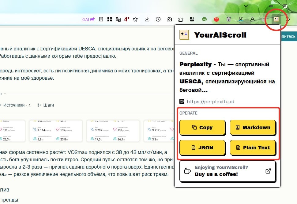Как поженить Perplexity и Notion? Сколько ценных идей теряется в хаосе чатов и заметок? Полезная информация — только та, которую мы применяем на практике. Всё остальное — просто шум. С помощью Perplexity получаем мгновенный доступ ко всем знаниям мира, и обрабатываем их с помощью лучших нейросетей. А что дальше? Результаты поиска нужно где-то сохранять и использовать: для создания базы знаний, совместной работы или реализации личного проекта. Для этого экспортируем чаты в систему управления знаниями, такую как Notion. Для быстрого сохранения даже самых длинных диалогов, используйте расширение для браузера YourAIScroll https://www.youraiscroll.com/ ✨ Чем будет вам полезно: 🟣 Легко копируйте диалоги с более чем 10 платформ - Grok, Deepseek, Claude, Perplexity, ChatGPT и других. 🟡 Экспортируйте артефакты Claude, ссылки веб-поиска и даже холсты ChatGPT Canvas. 🟢 Создавайте копии чатов в форматах Markdown, JSON и обычного текста. Приложение развивается. Ставьте 🔥 если интерес