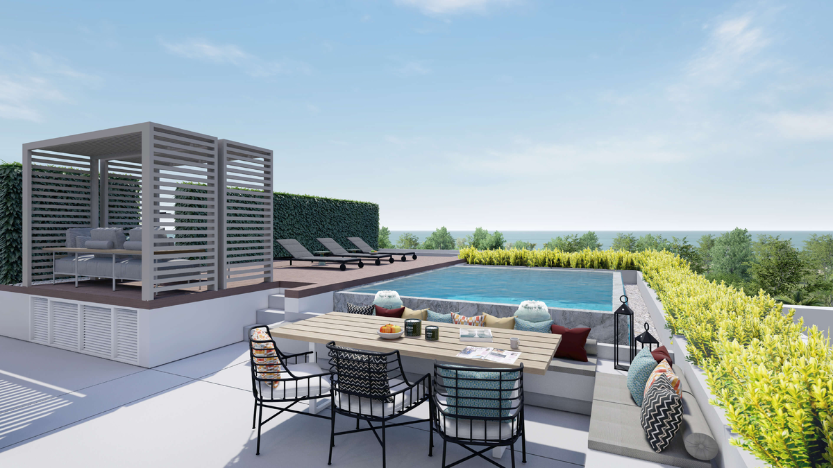 Все квартиры имеют открытую планировку, кухню с техникой, просторные санузлы и отделку премиум-класса. Некоторые юниты предлагают выход к бассейну прямо из спальни.