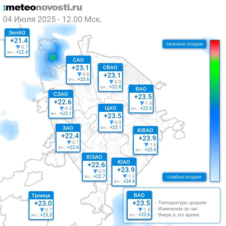 В 12:00 в Москве было от +21.5°C до +24.9°C, средняя температура +23.2°C #погода #Москва #лето #температура #4июля #пятница