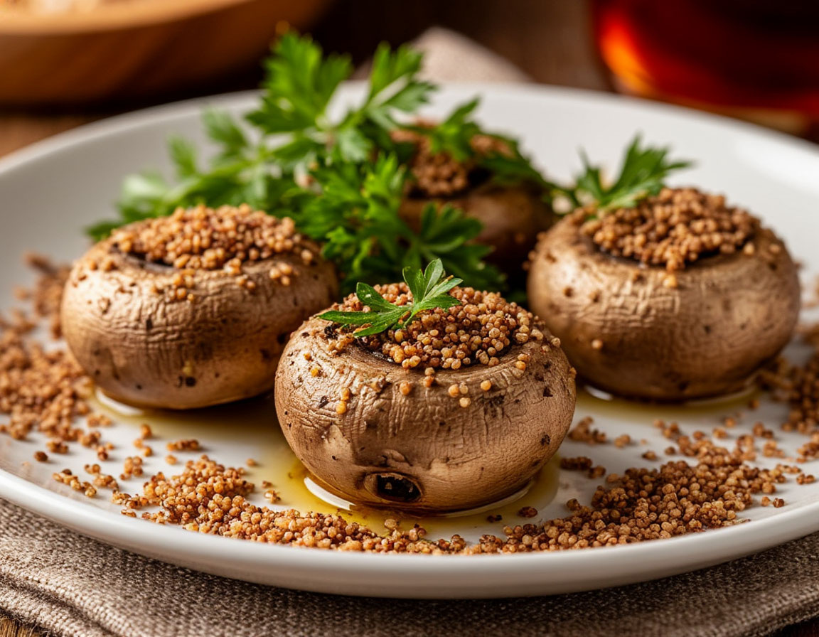 Фаршированные шампиньоны — это вкусное и полезное блюдо, которое отлично подойдет для вегетарианцев 0,5 стакана зерно амаранта Amarancho 1 шт лук 1 шт морковь 1 подложка шампиньонов По вкусу соль и перец 100 г сыр 1) Минимум за 8 часов до начала приготовления замочите зерно амаранта в прохладной воде. Слейте воду и несколько раз промойте зерно в проточной воде. Переложите в сотейник, влейте 250 мл горячей воды и посолите. Доведите на медленном огне до кипения, уменьшите нагрев до минимального, накройте крышкой и готовьте 30-40 мин. Несколько раз перемешайте лопаткой. Снимите с огня, накройте сотейник полотенцем и дайте каше остыть, 15 мин. 2) Вынимаем плодоножку из промытых шампиньонов 3) Измельчить соломкой лук, морковку, ножки шампиньонов и обжарить до золотистого цвета 4) Обжаренную массу посолить, поперчить 5) Полученную овощную смесь смешать с подготовленным зерном амаранта 6) Сыр натереть и добавить в полученную смесь 8) Шампиньоны нафаршировать начинкой и поставить в духо