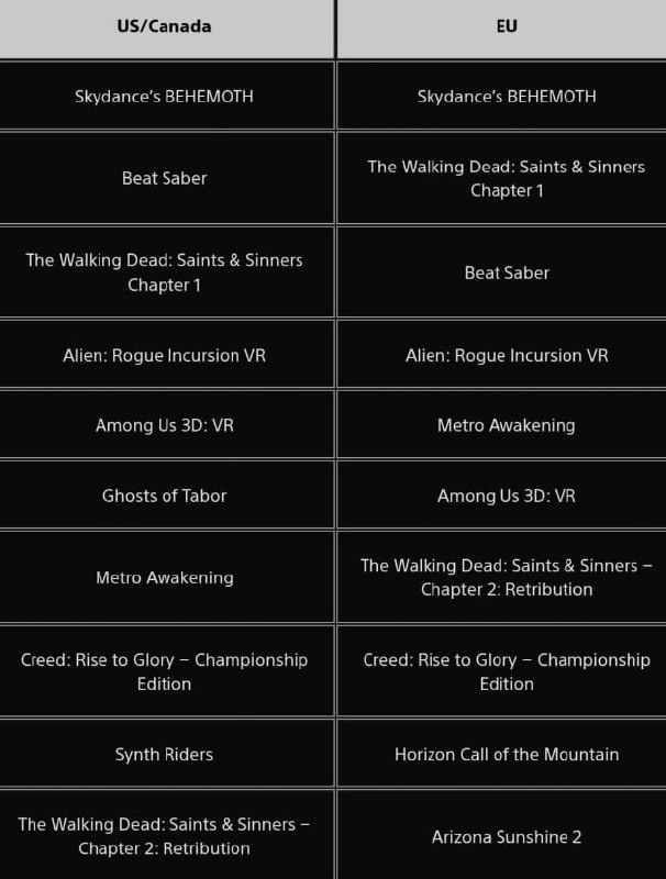 Skydance's Behemoth возглавила чарты PS VR2 в июне В июне 2025 года Skydance's Behemoth стала самой скачиваемой игрой на PlayStation VR2 в Европе и Северной Америке. Это произошло вскоре после масштабного обновления и скидки 50% на проект. На втором месте в Северной Америке и третьем — Beat Saber, несмотря на объявление Meta о завершении поддержки игры на PlayStation. Также от Skydance Games — The Walking Dead: Saints & Sinners занял второе место в Европе и третье в США после существенной скидки. Saints & Sinners Chapter 2 также вошёл в топ-10. Новых релизов для PS VR2 в июне не было, хотя вышли Epyka, Zombie Army VR, Badminton Time VR, Maestro и Presentiment of Death. Ни одна из них не попала в десятку лидеров. В июле вышли Firmament от создателей Myst (уже доступна на PS VR2), а также запланированы Cave Crave (10 июля), Chess Club и Space Drop.