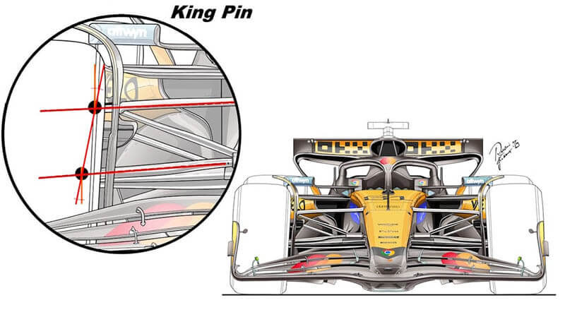 Регулировка этого параметра, которая изменяет угол поворота колеса относительно вертикали, явно направлена на то, чтобы предоставить Норрису более точную информацию о том, как ведет себя машина, и в особенности о сцеплении шин с трассой при прохождении поворотов. KPI работает совместно с кастором, обеспечивая увеличение или уменьшение развала в зависимости от угла поворота рулевого колеса.