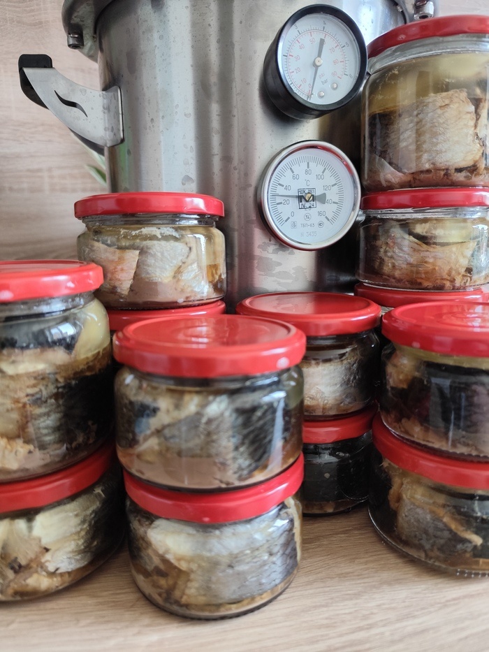 И понеслось...Это мое самое любимое приобретение наряду с термостатическим смесителем, посудомойкой и роботом пылесосом. Чего я только в нем не готовил: - тушёнка - само собой, - рыбные консервы (горбуша, скумбрия, селёдка) - каши с мясом (гречневая, перловая, горох, фасоль) - тушёная капуста с мясом (бигос) - картошка с мясом - клубничное варенье. Вроде ничего не забыл. Вот например вчера по акции закупил 5 кг селёдки и сделал консервы с добавлением масла: Все просто - почистил, порезал, посолил (1 процент соли от массы продукта) добавил в банки перец горошком и лаврушку, заложил, закрутил крышки и в автоклав до полной готовности (на 30 минут после достижения температуры 115 градусов). Из 5 килограмм селёдки получилось 14 баночек 250 мл и 2 баночки 350 мл. Плюс икра и молоки (пока не придумал что с ними сделать) и головы и хвосты (кошкам). Рыбу купил по 290 руб/кг. На самом деле самое сложное это было найти и купить банки в несезон. Купил я его в феврале - в сетевых магазинах банок не