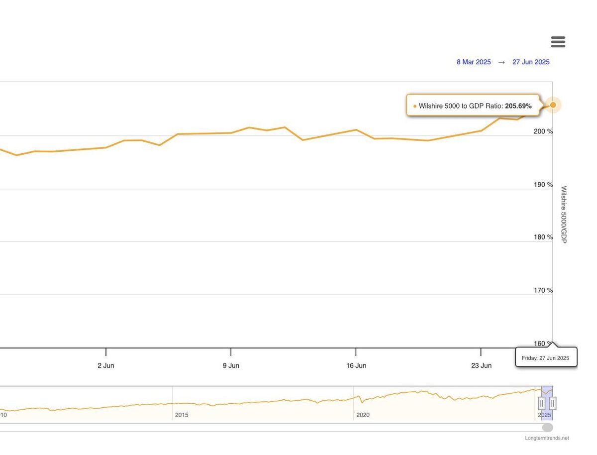 Индекс Баффета снова в зоне «невозможного» — 205.69% На графике — соотношение Wilshire 5000 (вся американская фондовая капитализация) к ВВП США. Этот показатель, известный как Buffett Indicator, часто называют «барометром перегрева рынка». — Текущее значение: 205.69% — Это выше пика 2021 года — Это в 2 раза выше, чем историческая средняя (80–100%) — И это происходит не в момент эйфории, а сразу после сильной коррекции Парадокс? Нет. Это — структура современного рынка. Ключевые причины: 1. Глобальный капитал охотится за доходностью Рынок акций США стал якорем для мировой ликвидности. Даже несмотря на высокие оценки, туда продолжают заходить деньги — особенно от системных фондов (как мы разбирали в прошлых постах). 2. Доля технологических гигантов в капитализации исторически высока Компании с высоким мультипликатором (AI, облака, SaaS) тянут индекс вверх, даже если экономика растёт умеренно. 3. ВВП — запаздывающий показатель, акции — опережающий Фондовый рынок сейчас закладывает в