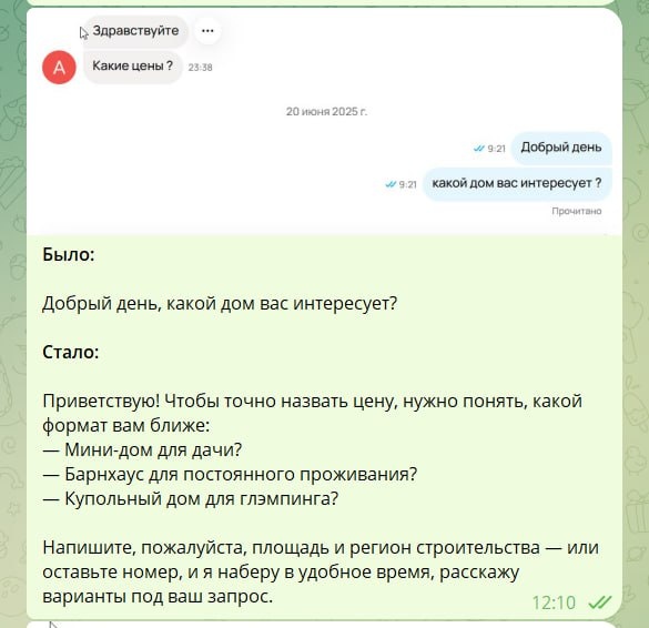 😵 «Какие цены?» — и вот тут большинство сливает клиента Смотри, реальный кейс: Ниша — каркасные дома под ключ. Чек — от 2,5 млн. Входящие заявки идут стабильные: — «Прайс скиньте» — «Это под ключ?» — «Какая цена за 70 м²?» А менеджер такой: — «Общий прайс не даём» — «3200 — без отделки» — «Какой дом вас интересует?» 🫠 Ну точно, теперь ты реально продал… 😐 ⸻ Вот что делает хороший ответ: он не “отвечает”, он вовлекает, продаёт встречу, прощупывает боли. ❌ Не “вкинуть цену” — ✅ А выйти в диалог и взять контакт. ⸻ 🔧 Пример, как надо: «Можем посчитать под вас. Подскажите площадь и сколько этажей планируете? Или напишите номер — я наберу без навязчивости, объясню, что входит и какие подводные». «Дом 60 м² “под ключ” — от 2,5 млн ₽. Но всё зависит от региона, комплектации и планировки. Хочу показать вам варианты — куда удобно прислать?» «3200 ₽/м² — это каркас. Под ключ — от 4100 ₽. Могу скинуть, что в эту сумму входит — только маякните, какой формат вам ближе: дача, постоянка