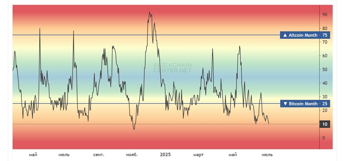 Это индекс сезона альткоинов, и мы видим, что он находится на историческом минимуме, а это означает, что альткоины находятся уже у самого